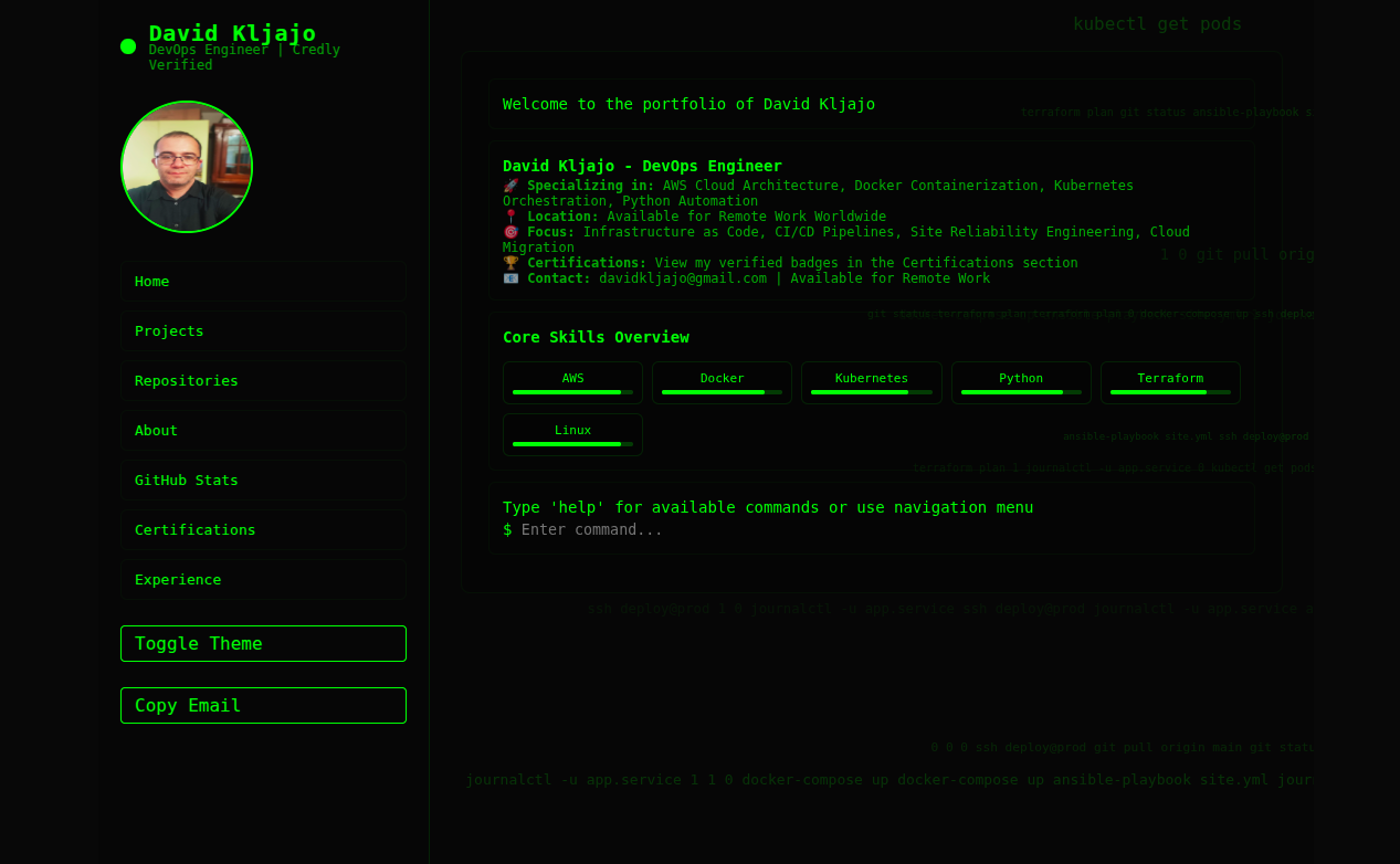 - Moj osobni statički web sajt , rađen u VanillaJS za upravljenje API pozivima, CSS za interaktivan pristup, gdje se kucaju linux komande za navigaciju sajtom, te GitHub Pages za hostanje: https://dkljajo.github.io/